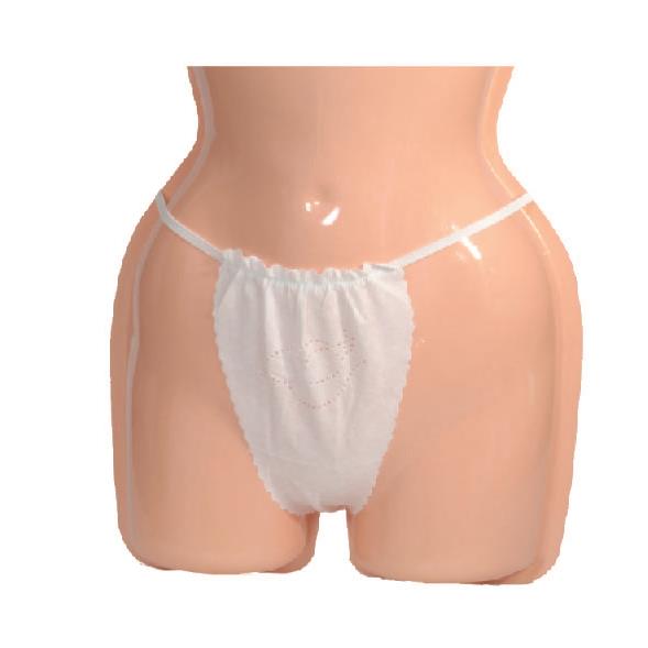 Białe stringi kosmetyczne wykonane z nieprzeźroczystej włókniny, posiadają elegancki wzór.